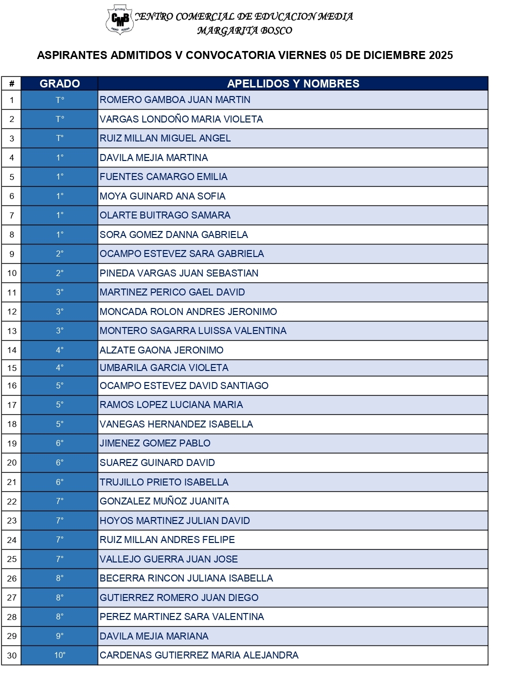 ASPIRANTES ADMITIDOS V CONVOCATORIA VIERNES 05 DE DICIEMBRE 2025