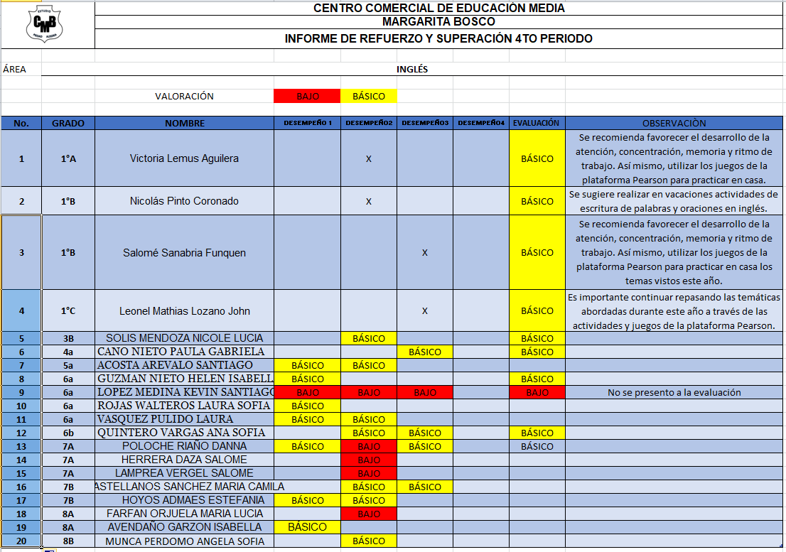 Para finalizar, es pertinente destacar que nuestros estudiantes al finalizar su etapa escolar se disponen a la presentación del examen de certificación con el British Council, en donde les evalúan writing, reading, grammar y listening, otorgando en los últimos años puntajes de B2 Y C1, junto con percentil alto de las pruebas de estado en el área de inglés.