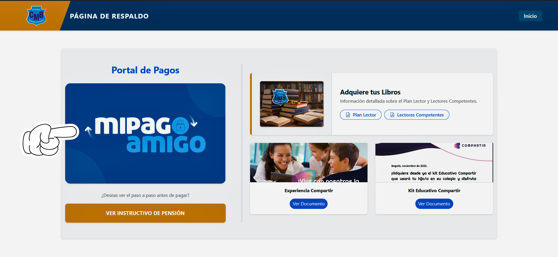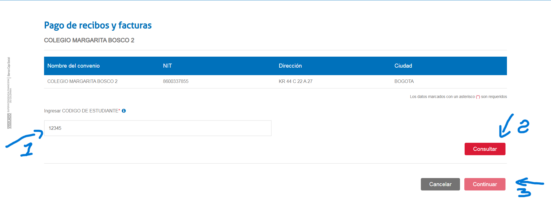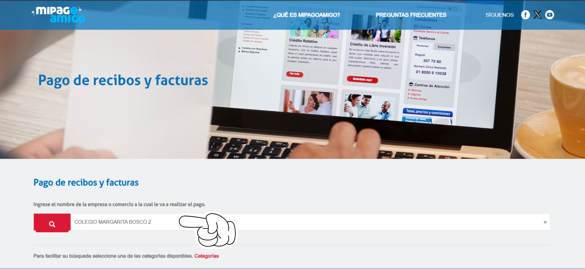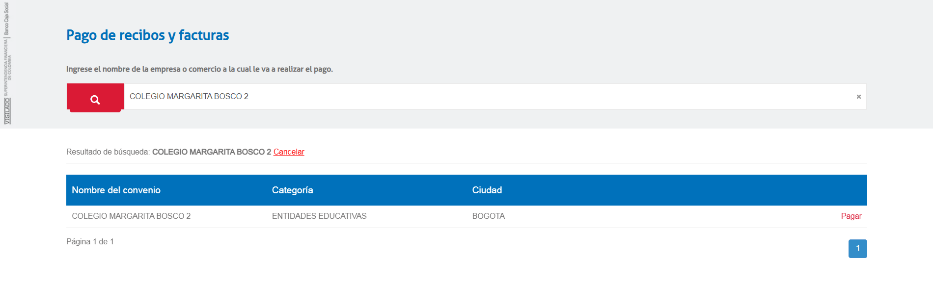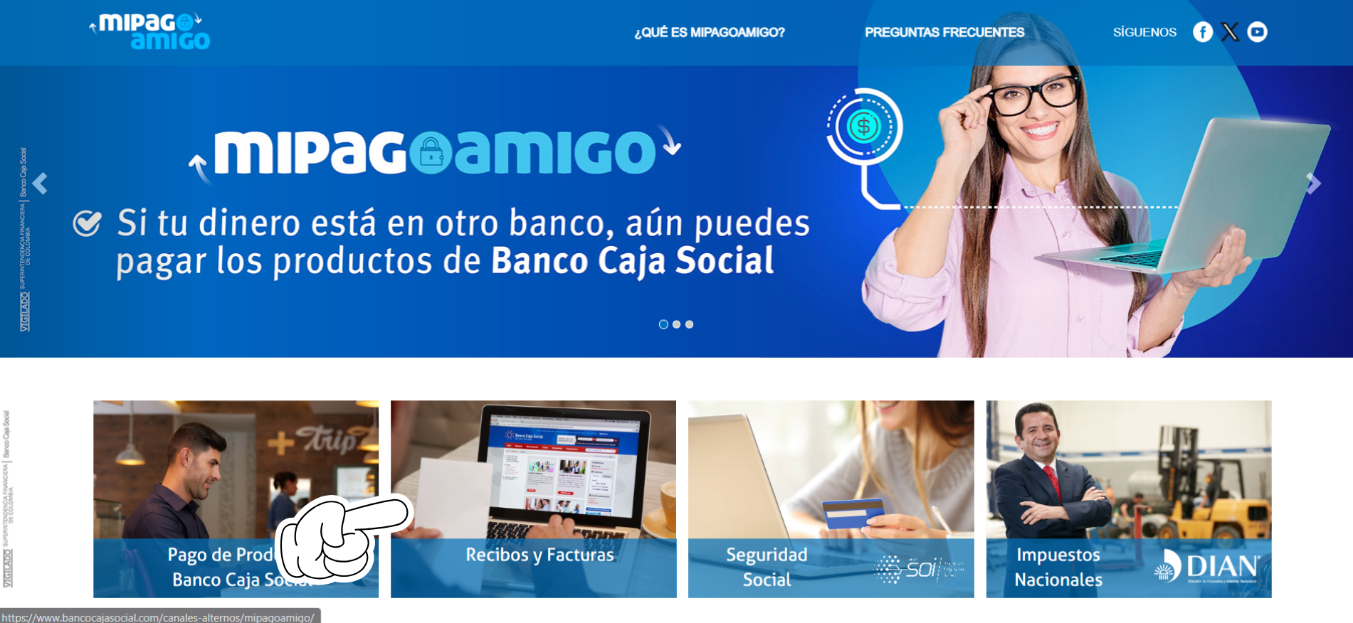 Busque el botón de pago en el menú vertical derecho. Este lo redirigirá al portal del Banco Caja Social.