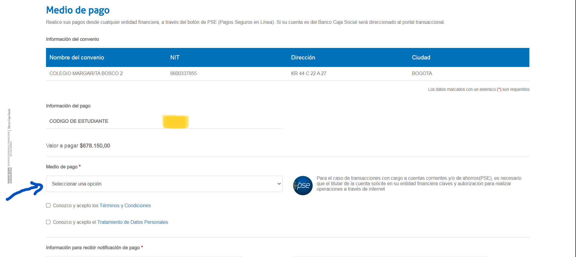 Seleccione el medio de pago (PSE u otros) y complete la información solicitada por su banco.